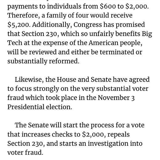 The House will deliver nothing on Section 230, and the Senate will be delayed in any action on a $2000 stimulus until after Joe Biden assumes the presidency. The Senate will meet on December 29th to officially override Trump’s veto of the NDAA. Trump will get nothing from his grandstanding on either bill.