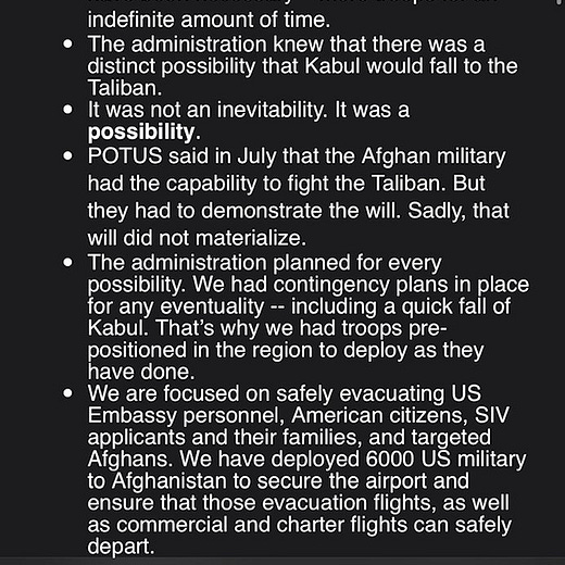 Instead, we got these talking points on Afghanistan from Speaker Nancy Pelosi, who had to step in because the Biden White House was basically on vacation.