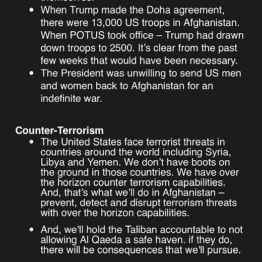 Meanwhile, Biden continues to claim that there was no way to get out “without chaos ensuing.” That may well be true at some level. But it seems the way it was done didn’t seek to minimize, or even suppress, the chaos. It depended on some unwise and ridiculously optimistic (even impossible) assumptions, that in the real world, turned out to be as reliable as Trump’s election fraud claims.