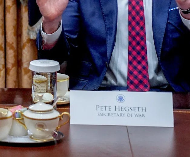 During the latest cabinet meeting, Secretary of Defense War Pete Hegseth’s name card was misspelled. He’s the “SSecretary of War.” I tried to get Grok or ChatGPT to make a cartoon version of that, but I’m not good at writing prompts to get those AIs to make decent images. David Thornton is a lot better at it.