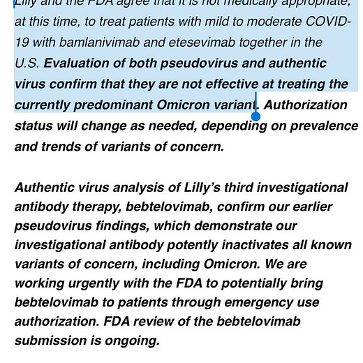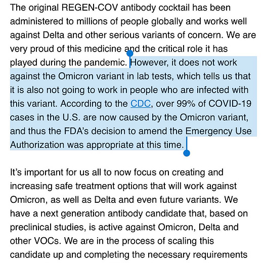 In reality, both Regeneron and Eli Lilly acknowledge that their treatments are not effective against Omicron. That’s pretty strange behavior for Big Pharma companies that could be raking in boatloads of cash for selling their treatments in a pandemic… if they worked.