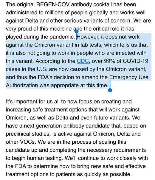 In reality, both Regeneron and Eli Lilly acknowledge that their treatments are not effective against Omicron. That’s pretty strange behavior for Big Pharma companies that could be raking in boatloads of cash for selling their treatments in a pandemic… if they worked.