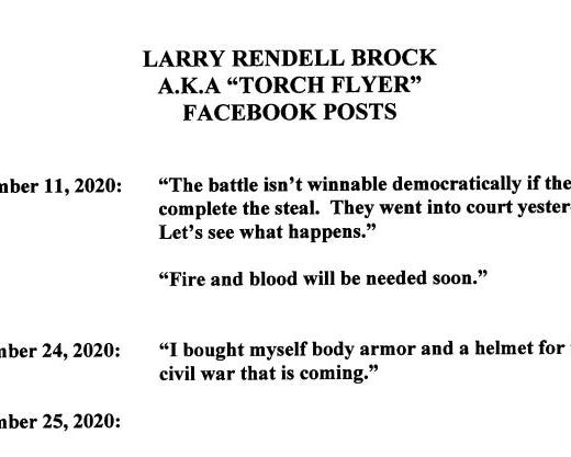 Another insurrectionist, retired Air Force Lt. Col. Larry Rendall Brock Jr. of Texas, was among those who carried zip-ties into the Capitol. Prosecutors note that Brock seemed to have more sinister plans than just protesting that day.