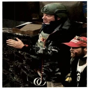 Chansley wore horns, a furry coyote tail headdress, red, white and blue face paint, and tan pants. He was shirtless and carried a bullhorn and a six-foot-long spear with an American flag tied just below the blade.