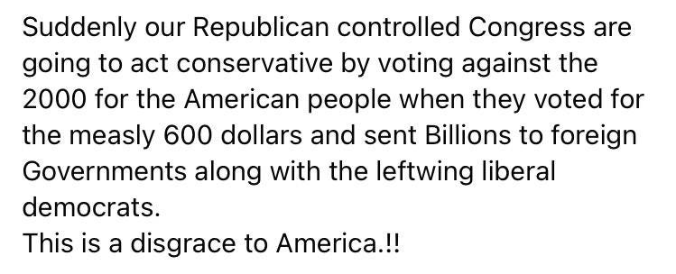 Let’s take a moment to dissect this. In the first line, my Trump Train friend actually complains that Senate Republicans are acting in a conservative fashion by opposing the $2,000 relief payments proposed by President Trump and agreed to by the House.