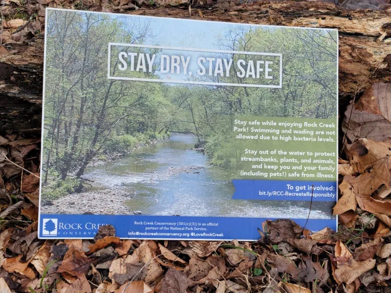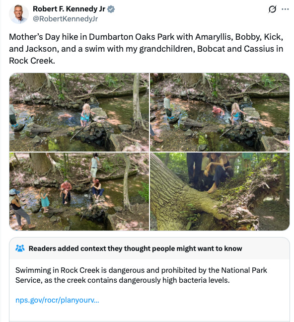 I think RFK Jr.’s sewer swim is a decent example of where we are with our national government. Sure, there’s signs at Rock Creek Park warning you to “stay dry” because of high bacteria levels. And they were ignored. The signs are there to warn the public, but many people ignore them. The signs were placed by our government, and one of the highest positions in the Trump administration cabinet ignored them.