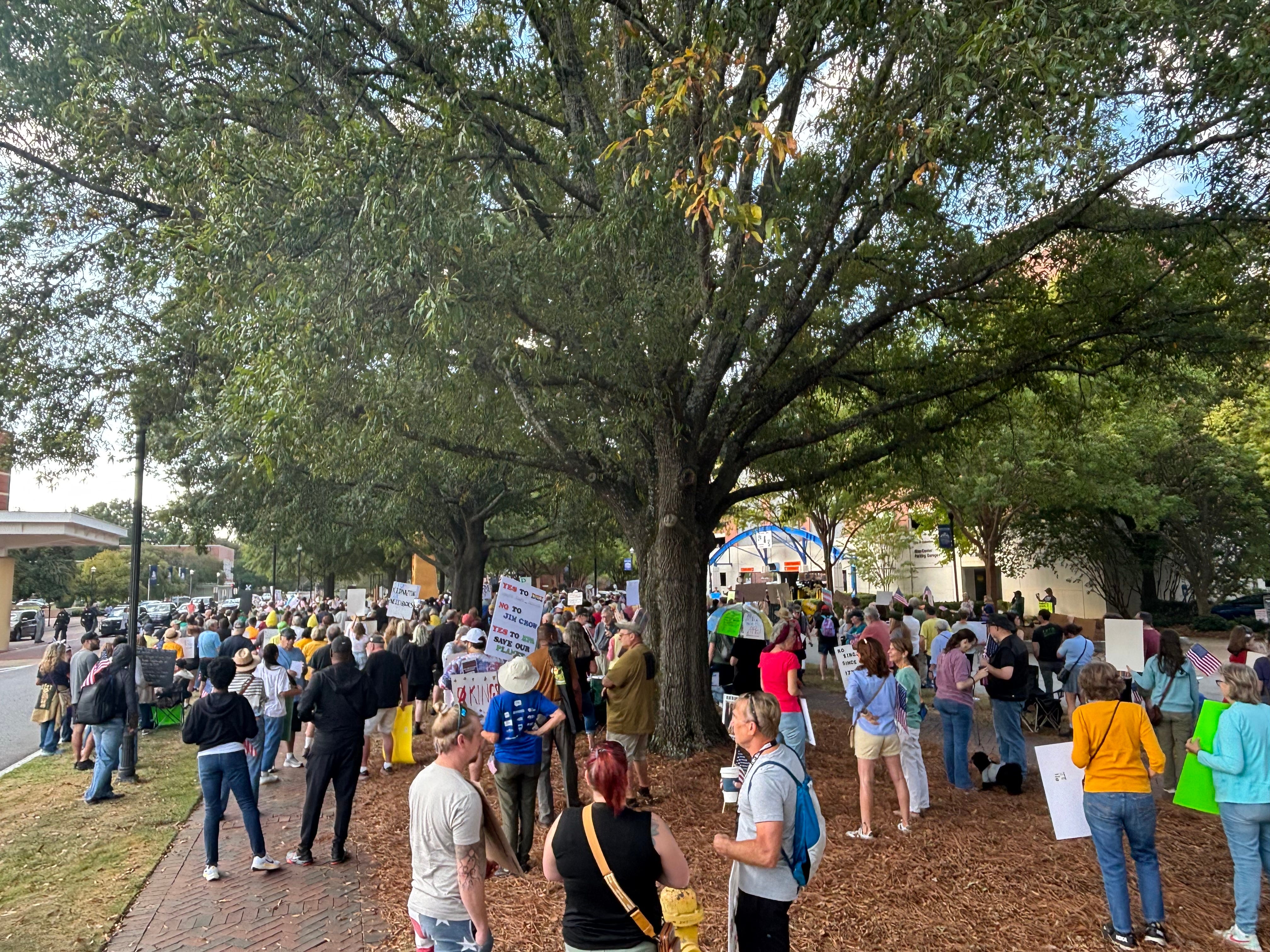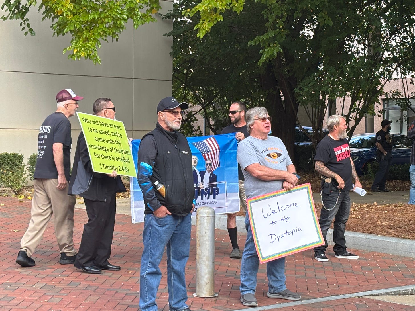 Three Trump supporters, one of whom was open-carrying a pistol, staged a small counterprotest and were almost uniformly ignored by the crowd. This stands in contrast to the large number of Trump supporters that I saw heckling Harris supporters outside a rally headlined by Tim Walz before the election.