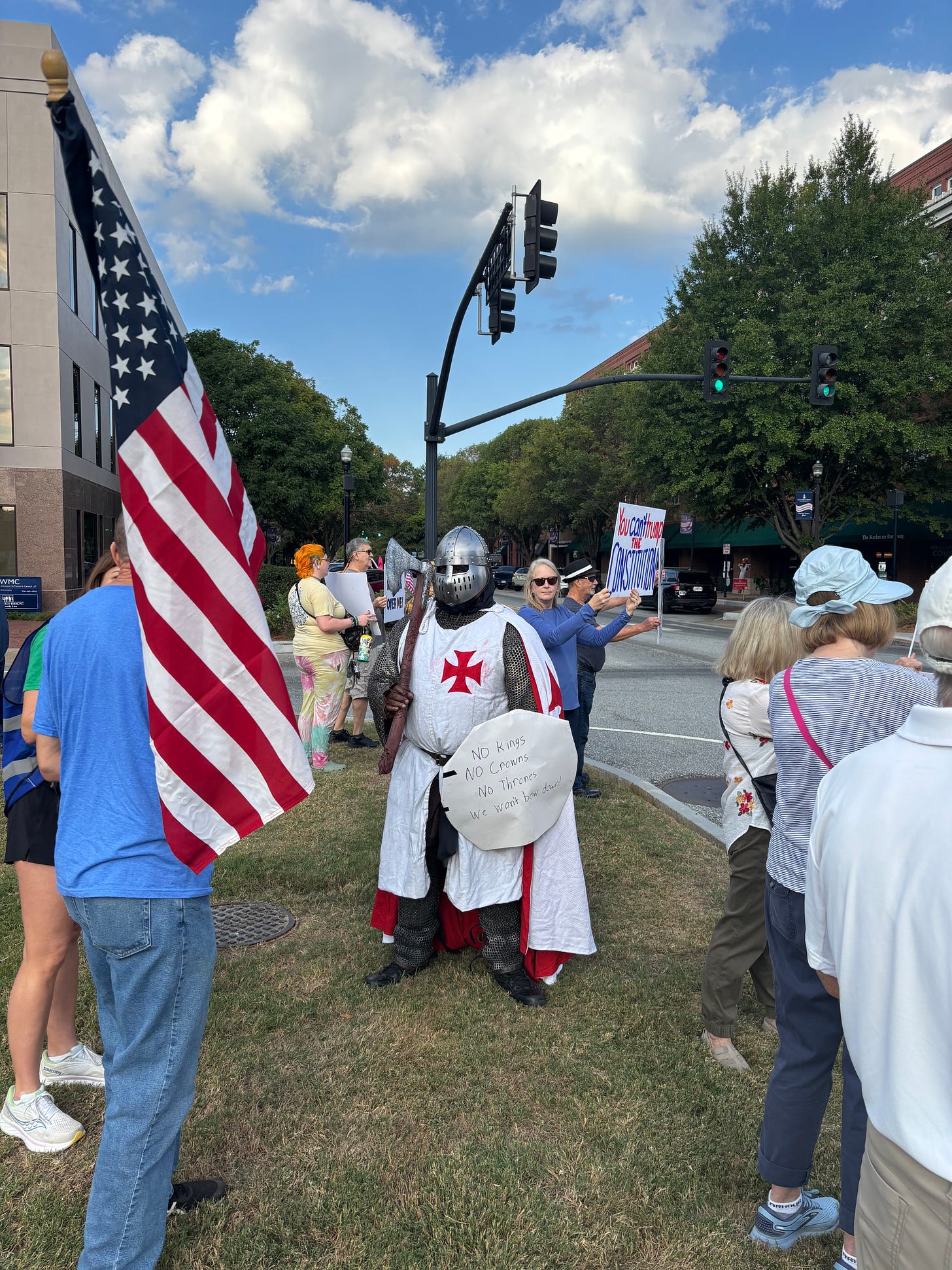 So, I went to the No Kings rally in my town, not sure what to expect. The crowd was larger than I expected with several hundred happy, friendly, polite people of all ages and ethnicities. There were a few people who looked stereotypically leftist, but most looked like people from next door, although some wore costumes. There was a unicorn, a knight, and a man in colonial garb, which may be what made me think of the Tea Party.