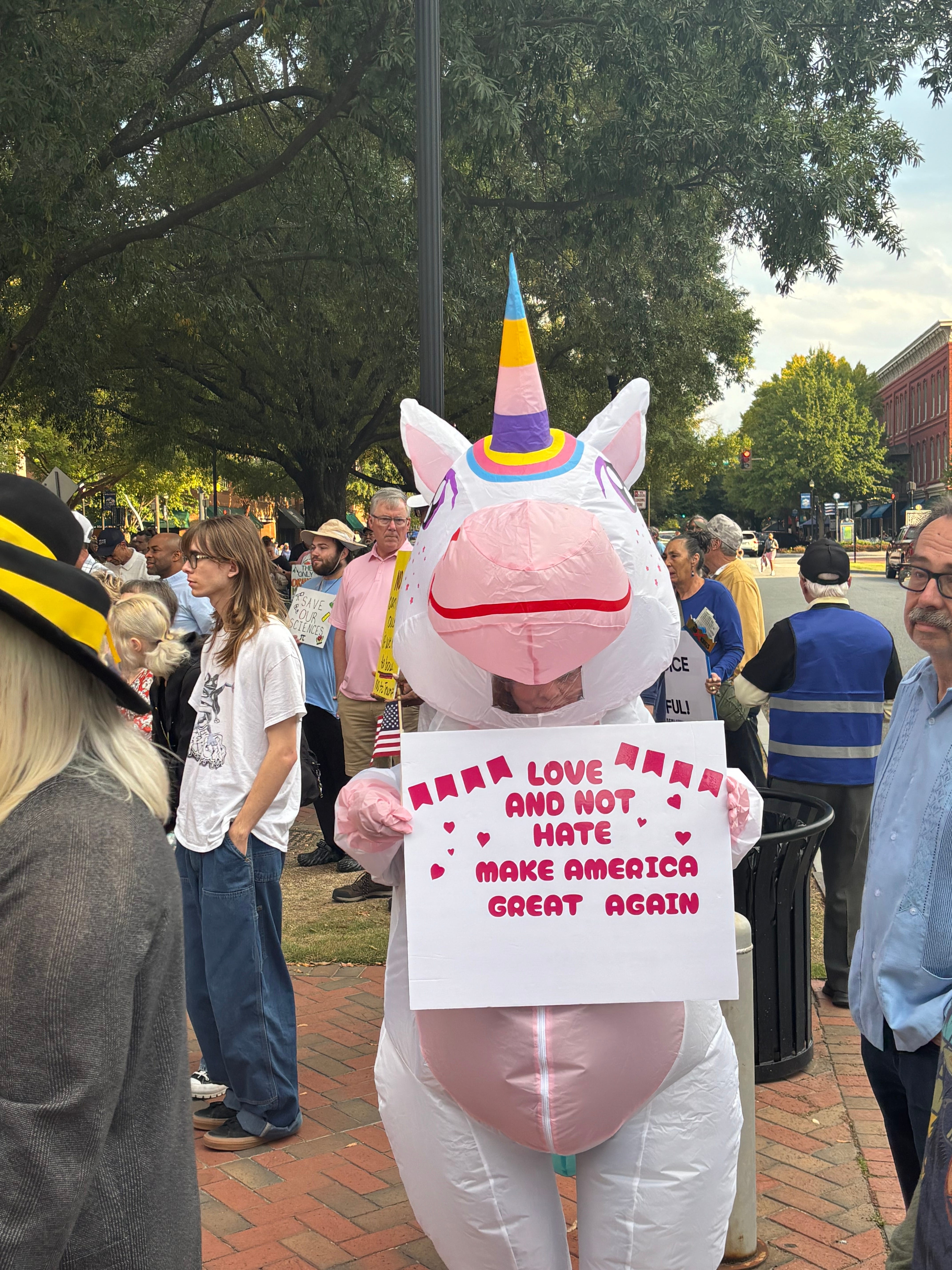 For me, the rally wasn’t about being entertained, although I had a good time mingling with the crowd and taking pictures of some of the more notable costumes and clever signs. It was about showing up and exercising my right to tell the country that I do not support what the Trump Administration is doing. I showed up because if we don’t exercise our First Amendment rights now, we may not be able to in another few years.
