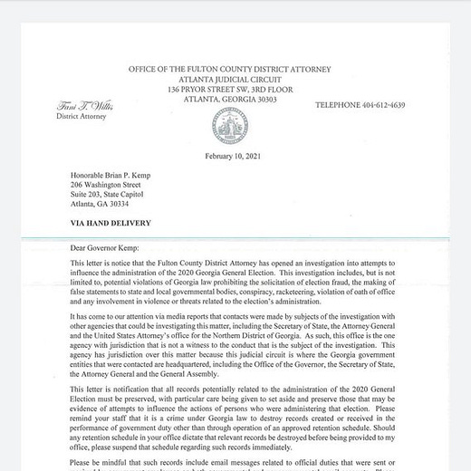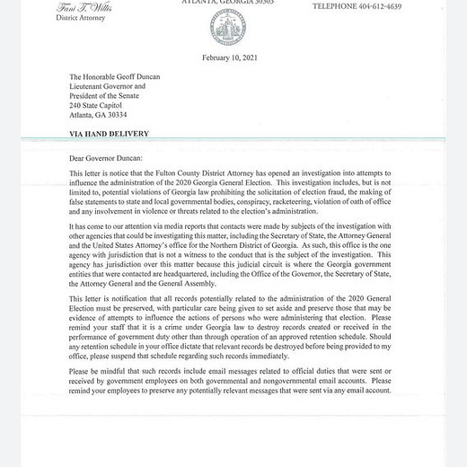 Willis sent a letter to Georgia’s top elected officials, notifying them “that all records potentially related to the administration of the 2020 General Election must be preserved, with particular care being given to set aside and preserve those that may be evidence of attempts to influence the actions of persons who where administering that election.”