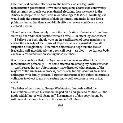 "By objecting to electoral slates, members are unavoidably asserting that Congress has the authority to overturn elections and overrule state and federal courts," she said. "This is directly at odds with the Constitution's clear text and our core beliefs as Republicans."
