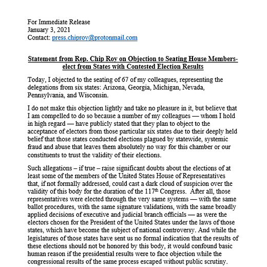 Another Texas Republican, Rep. Chip Roy, is pointing out the inherent flaws in claims of election fraud by challenging the seating of congressional delegations from Arizona, Georgia, Michigan, Pennsylvania, and Wisconsin. Roy reasons that if fraud allegations in the presidential election are true that they also “raise significant doubts” about congressional elections.