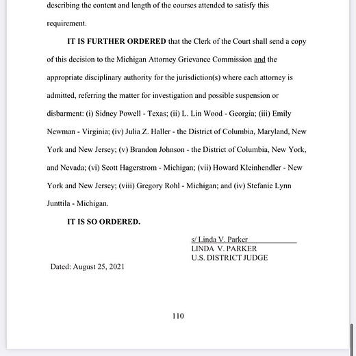 I haven’t read the full document, which is linked in the tweet above, but the judge called for sanctions against Lin Wood, Sidney Powell, and others. The Kraken attorneys will be forced to pay legal fees for the State of Michigan and the City of Detroit and will have to take continuing education courses. The lawyers may end up being disbarred for their actions in the frivolous lawsuit.