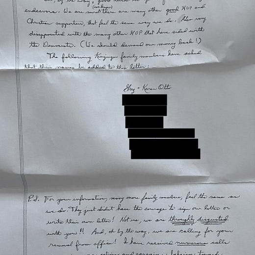 The author of the letter was Karen Otto, Mr. Kinzinger’s cousin, who paid $7 to send it by certified mail to Mr. Kinzinger’s father — to make sure the congressman would see it, which he did. She also sent copies to Republicans across Illinois, including other members of the state’s congressional delegation.