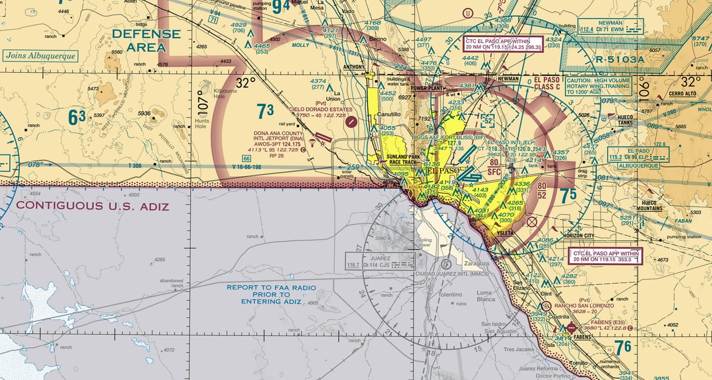 The F.A.A., without warning, shut down El Paso airspace, within 10 nautical miles of ELP airport, up to 18,000 feet. The notice said it’s for “Special Security Reasons,” which is not specified. The Temporary Flight Restriction (TFR) is from February 10, at 11:30pm until February 20, at 11:30pm. Ten days, no air traffic. No flights in or out, not even general aviation. This has never been done since 9/11, and even then the shutdown was not for 10 days.