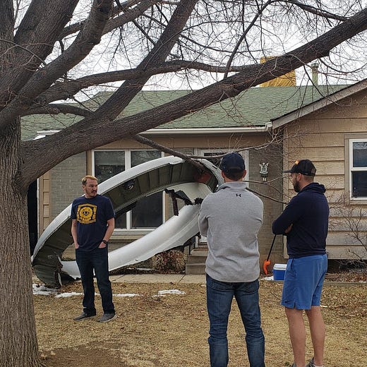 Other pictures show the large, circular engine inlet cowling resting in the yard of a house. It is remarkable that no one on the ground was injured by falling debris.