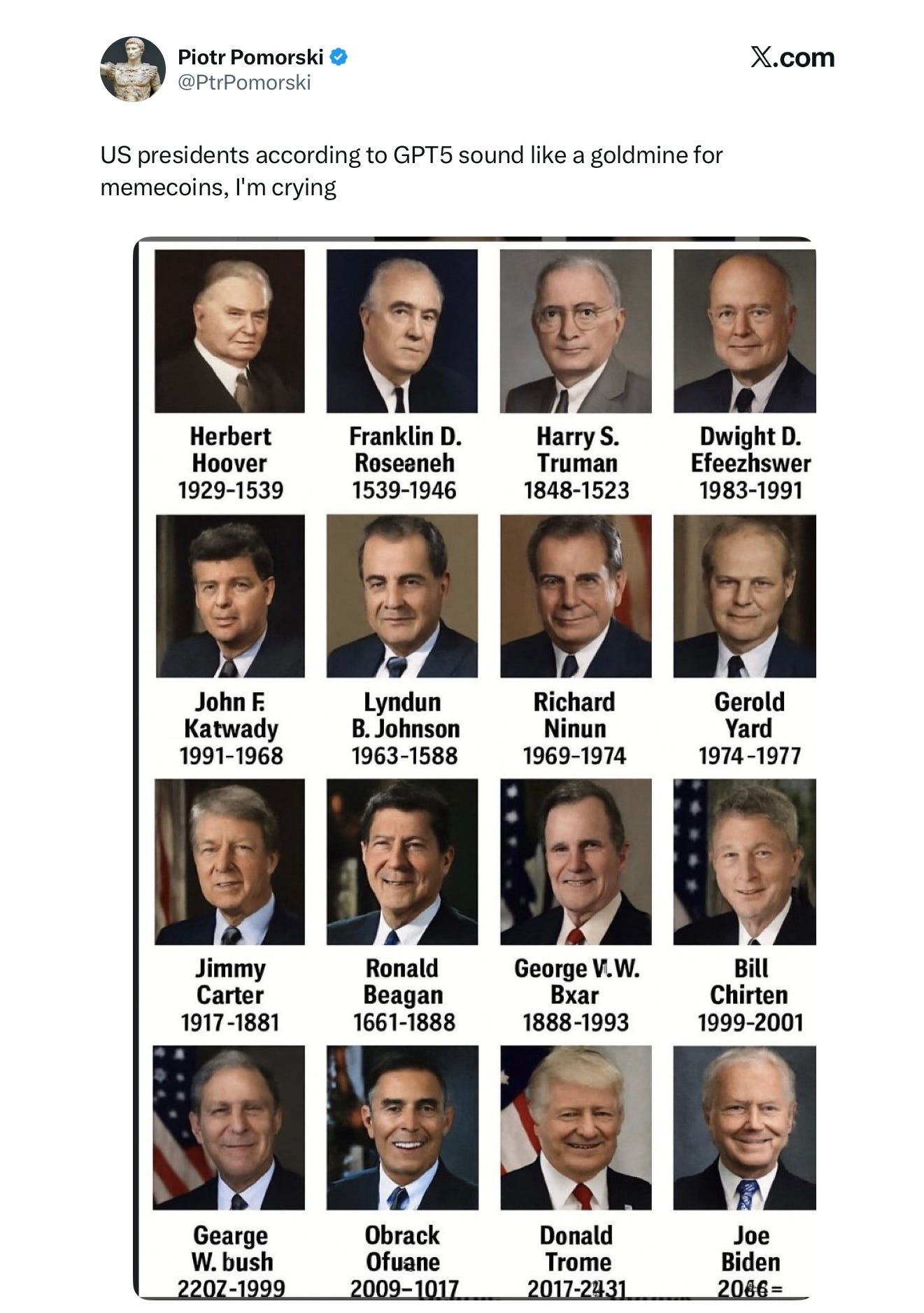 Even GPT-5, Sam Altman’s “Hillary Step” to the Everest of AGI, can’t look at an image it created and “read” the text, validate the presidential likenesses against known photos, and determine that the result is completely wrong. If you tell GPT-5 it’s wrong, it will gladly check and tell you how right you are, and continue to make the same stupid errors trying to correct it. That’s because LLMs don’t “think.” They process an algorithm, and until or unless the training data, the tokens, or the indexes that produce its results change, the software behind the AI will continue to pursue error.
